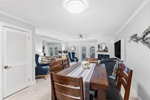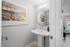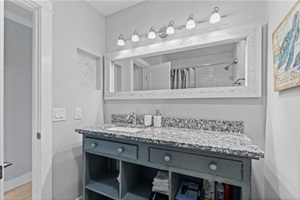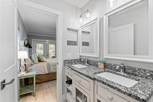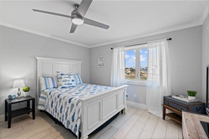 Upstairs, you'll find two bedrooms and two full baths. The master offers a king bed with ceiling fan, clothing storage, smart TV and ensuite bathroom with double vanity and a walk in tiled shower. The second bedroom has a queen bed plus a twin trundle, ceiling fan, clothing storage, smart TV and bathroom with tub/shower combo.